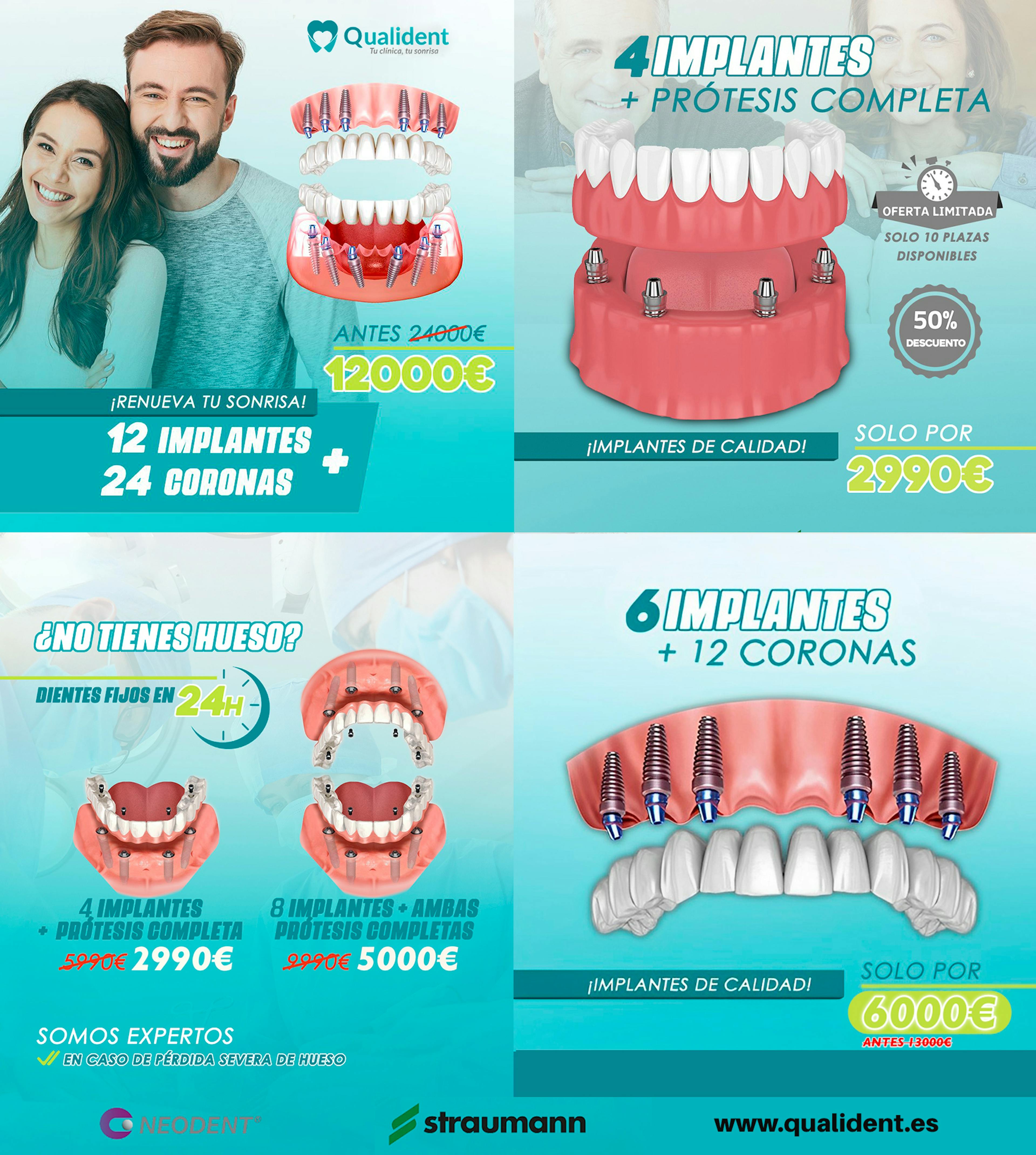 - 4 implantes + prótesis completa: 2990€